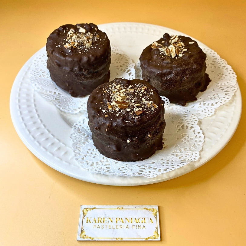 Delicioso bizcocho de chocolate húmedo, con relleno de manjar y queso crema, bañado en chocolate bitter con pecanas.